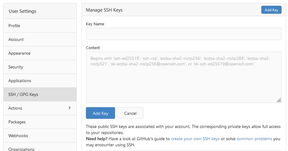 Click "Add Key" on the top and paste the public part of your SSH key into the content part with: