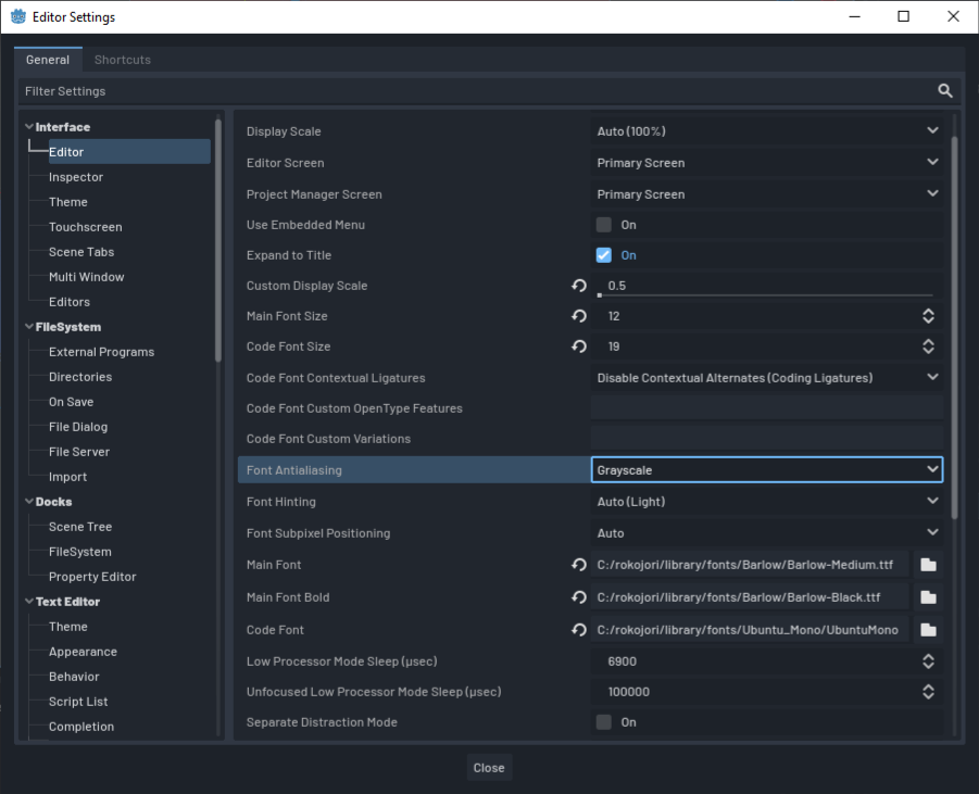 If you want to use my fonts, download them here: Barlow and Ubunut Mono Adjust▶Custom Display ScaleSet▶Main Font SizeSet▶Code Font SizeChoose▶Font AntialiasingSelect▶Main FontSelect▶Main Font Bold
